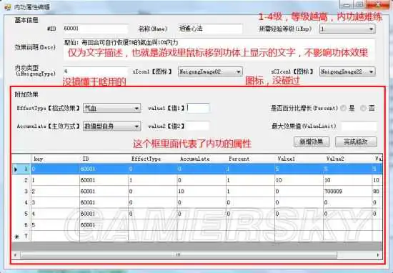 接下来我们就可以开始修改内功属性了,有了mod工具的好处就是不用自己再对着数字和特性翻来覆去地看了。每个内功貌似最多5条属性,逍遥心法别看描述只写了每回合回血5%回蓝10%,但实际却是三个属性,分别是: