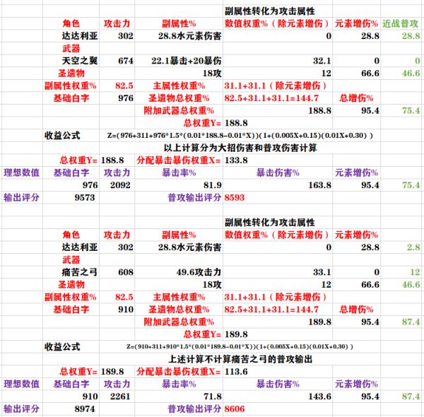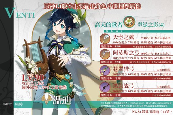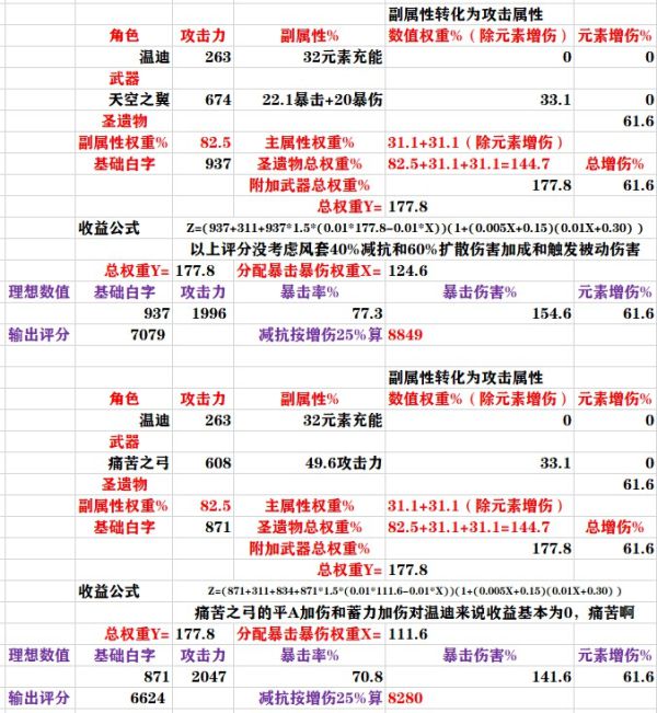 天空之翼优秀的副属性使得温迪堆属性更加容易。不过温迪初始攻击263比卢姥爷低了72白值,估计原本官方定位就是辅助吧。可以看出痛苦之弓其实并没有落后天空之翼很多,但是痛苦之弓附加的普攻和蓄力伤害加成对温迪来说基本没用,好痛苦啊。同时痛苦之弓的攻击力加成也必须当做固定溢出攻击力进行计算,翠绿之影的减抗按25%伤害提升计算。不要再拿温迪和刻师傅比了,温迪最后系数*1.25是按辅助能力算的,不是输出提升。