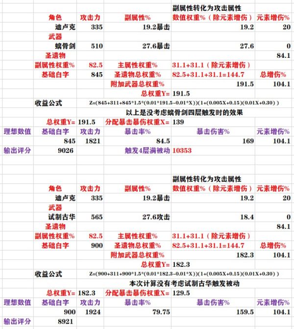 由于零精炼狼的末路+时之沙已经有了116.2%百分比攻击力,已经远高于攻击力最佳分配值。本次计算把这些攻击力变为恒定攻击力进行计算,同时带狼末需要的圣遗物基本全为暴击/暴伤。零精狼末和零精天空差距还是有11~12%左右,在满精条件下这个差距会缩小至5~6%。螭骨剑四层满被动表现非常优秀,只是叠起来很难。钟离出来可以尝试看看能不能帮助叠被动。试制古华的评分没有计算其触发白字伤害。