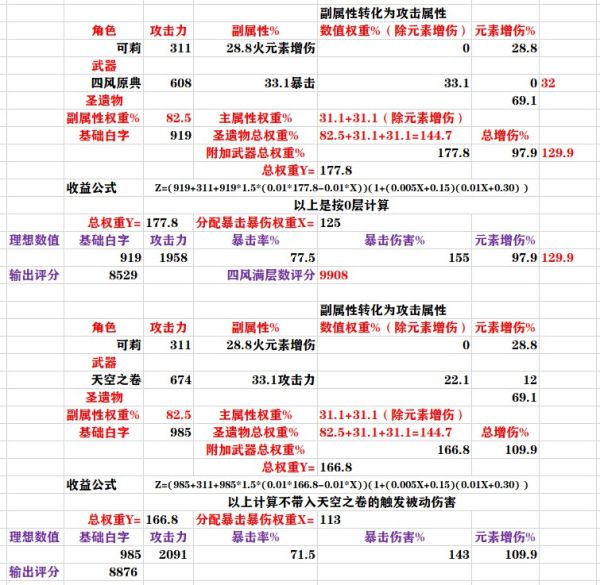 四风原典加可莉升级加的火元素伤害加成,真的是能把可莉的火元素伤害加成堆的非常高,同时可以看出可莉数值其实非常优秀。只是输出方式可能不是很高效。同时可以看出四风原典在满被动和0被动差距还是蛮大的。天空之卷的话,刚好是处于四风原典满被动和零被动中间的强度,非常中规中矩。