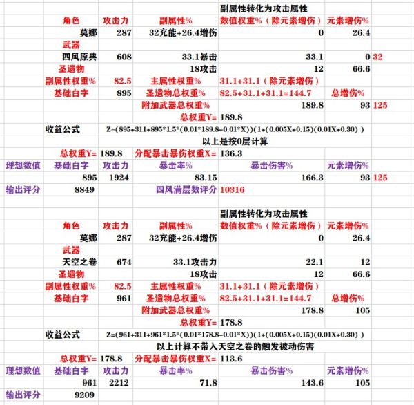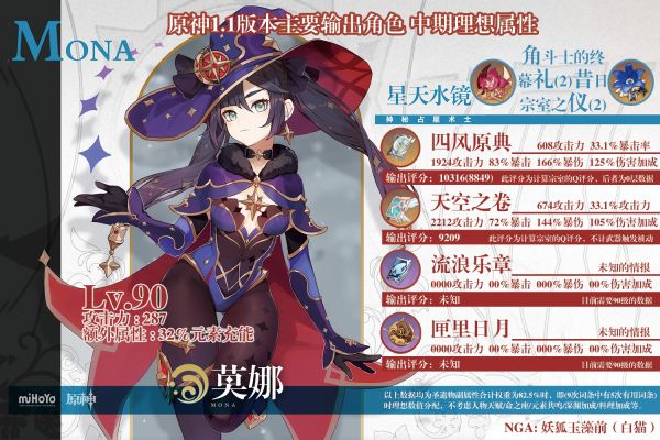 莫娜的输出评分是按照流行的核弹莫娜来评分的,可以理解为只放Q的伤害多少。莫娜天赋元素充能转化为伤害加成还挺香的。可以得到与可莉差不多的结论,天空之卷仍然中规中矩。