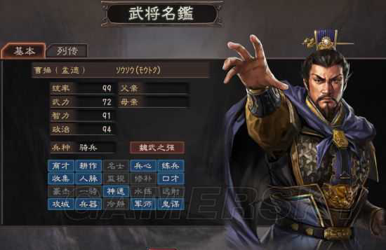 统帅 99 武力 72 智力 91 政治 94 兵种 骑 战法 魏武之强 指挥 7