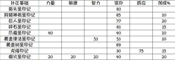 因为是补正数据,所以只写上了非基础的部分,基础的100法强加上,才是触媒那里你看到的法术加成,例如30信仰的指头印记,游戏内面板显示应该为100+表中88,所有的游戏内法强都要在表的基础上+100。
