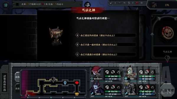 地牢的基本机制为每往前一步都会增加“压力”值,可以看到上图左下的数值和红色区域:数值决定了压力数值的上限,而不断推进的红色区域会快速增加玩家英雄的“怨念”数值(一种san值状态),在双重压力下,需要在每一格的小地图和整体的地牢大地图中都近两天少走回头语——当然,也要准备一些类似于十字镐这样的探索道具防止路上被耽搁太久,对应压力机制每个地牢都有其探索目标——消灭特定怪物、获取特定道具或者访问一定数量的房间都可以,而无需完成整个地牢的探索。