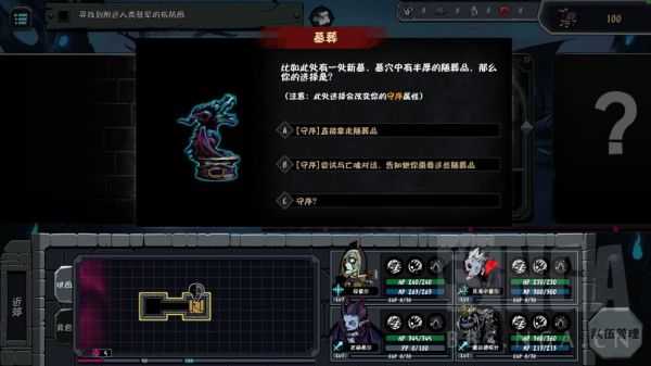 游戏的san值系统分为腐朽(主要来自于死灵生物的技能)、溃散(受伤即可获得)、怨念(地图有一个类似吃鸡的毒圈不断前移,在毒圈内就会大幅增长怨念)——除了这些固定获得方式,各类迷宫事件都有可能掉san值,类似于暗黑地牢,任何一项san值到100都会给一个强力DEBUFF,当然本作的花样远远没有暗黑地牢那么多,副作用的效果也没那么强力(比如只是跳过第一回合/-10%伤害之类的)