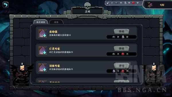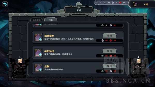 主城升级分为永久能力升级(蚊子腿)和各种天赋升级(比如经验获取、道具携带等等),这些都是可以反复升级叠加,但是对应的性价比会越来越低。升级道具需要在地牢探索中获取。