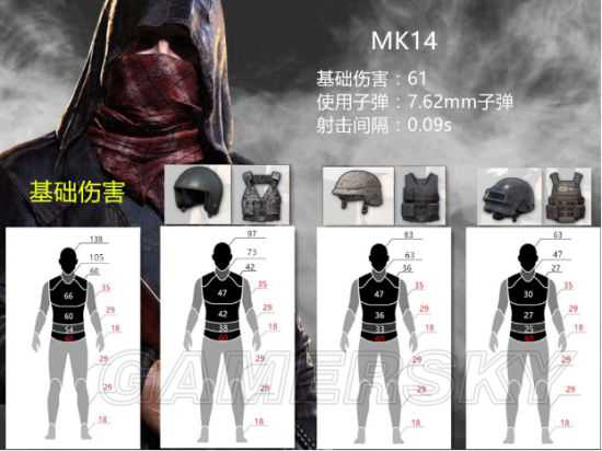 MK14的基础伤害是61,相比SKS的57要高出4点伤害,不要以为这才4点伤害就可以忽略不急,要是现在版本的M24哪怕加1点伤害,估计选择AWM的玩家都会少,下面来看看MK14的具体伤害。