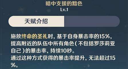 「暗中支援的黯色」是「罗莎莉亚」的固有天赋,由元素爆发「终命的圣礼」触发,效果为释放「终命的圣礼」时基于「罗莎莉亚」属性面板暴击率*15%增加其他队友的暴击率,持续10秒,最高不超过15%。