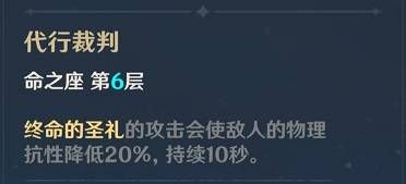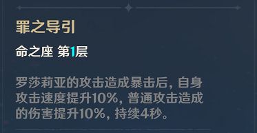 3.「罗莎莉亚」释放元素爆发时能通过天赋能给队伍中的其他角色增加暴击率,并且命之座 第6层的效果还可以使元素爆发降低被攻击到的敌人的物理抗性。