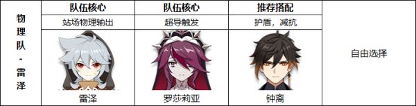 此时「罗莎莉亚」在队伍中作为辅助或兼具速切/后台输出,提供冰元素附着与「雷泽」的技能触发超导效果减少敌人物抗。