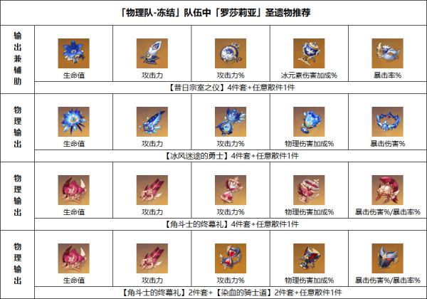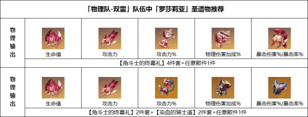 根据队伍不同的搭配方式,「罗莎莉亚」在队伍中会有不同的定位。以下为对应的一部分队伍的搭配参考: