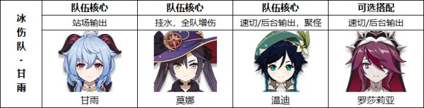需要「重云」提供冰元素附魔,由「行秋」提供高频挂水来维持冻结效果,优点是能很好地利用到【冰风迷途的勇士】2件套和2件套效果,且输出环境较为安逸;缺点是需要敌人可以被冻结,而且队伍整体倾向于对单输出。