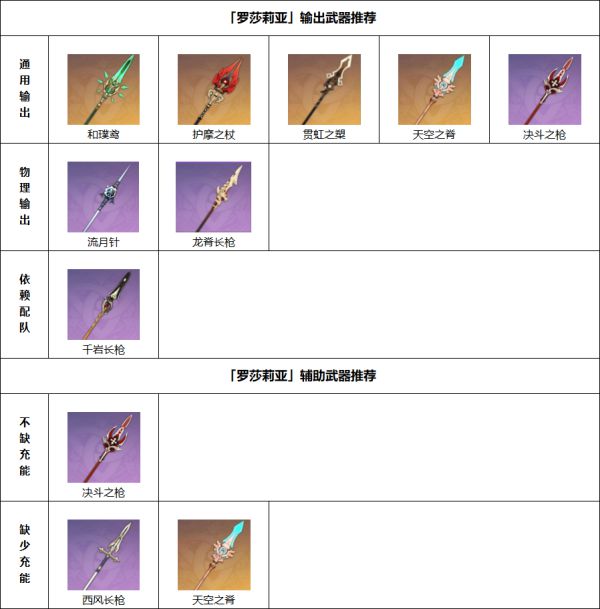 仅作为辅助时,建议根据圣遗物的词缀情况(特别是充能属性,能否保证每输出循环都有元素爆发技能使用这点至关重要),可以在【西风长枪】、【天空之脊】、【决斗之枪】这些武器中选择。