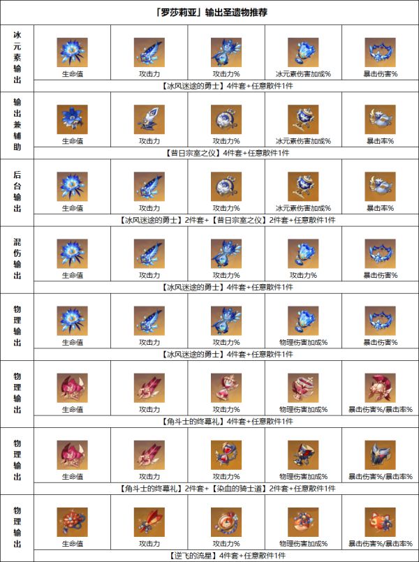 作为输出时,圣遗物套装选择主要会在【冰风迷途的勇士】4件套(需要保证冰元素附着的高覆盖率,最好能冻结)、【昔日宗室之仪】4件套、【角斗士的终幕礼】4件套、【逆飞的流星】4件套(需要保证护盾的高覆盖率)、【冰风迷途的勇士】2件套、【昔日宗室之仪】2件套、【角斗士的终幕礼】2件套、【染血的骑士道】2件套,这些中进行搭配组合选择。