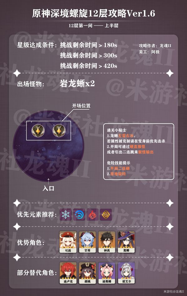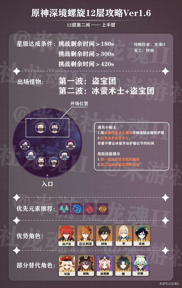 另外重要的就是拉怪的手法,如果有携带风属性角色,拉怪遵循的原则就是克制哪一个法师,就往哪一个法师那边跑,并扩散他的元素,另一个法师会自己跑过来(举例,例如12-3上半携带有行秋而没有携带冰,则往火法师处跑,扩散火元素,然后用水属性破火法师盾)破盾以后注意把怪集体往墙边打,不要推散。