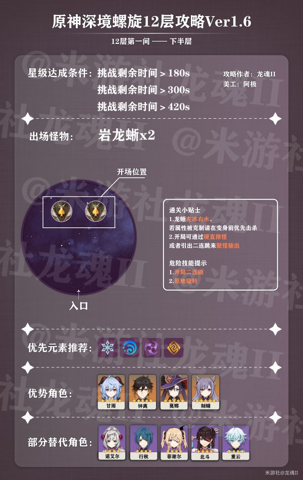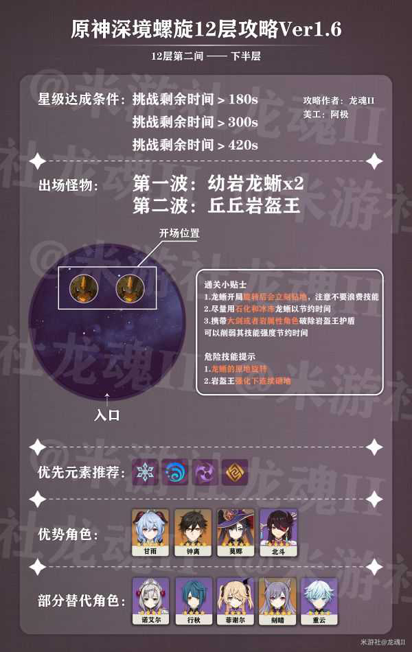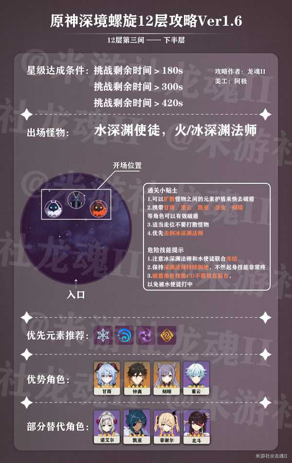 12-3部分主要也是下半比上半难打,主要问题在于破盾,上半可以很轻松的用功能性很强但是又不打输出的班尼特来轻松破盾,但是下半冰属性角色必定占用一个输出位,所以上半的阵容比较好配,下半多半有点强行塞进去的感觉。但是如果不能进一步提升伤害了在破盾上下功夫会有奇效,哪怕是稍微牺牲一点输出也是值得的。