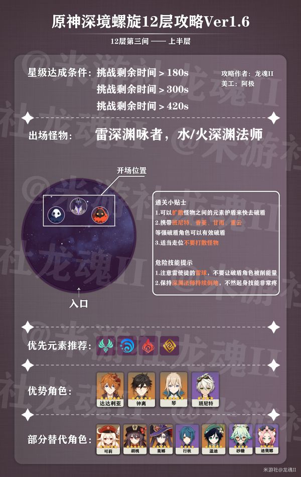 总体来说这一期12层的怪物难度是下调了,但是破盾要求还是提高了,阵容不影响通关,甚至很低练度都可以通关,但是如果没有相应的破盾角色,阵容不对即使输出比较高也很难满星。图中的推荐角色也是为了方便一路打到下一层而推荐的,不是说这一层非得上这个角色不可。
