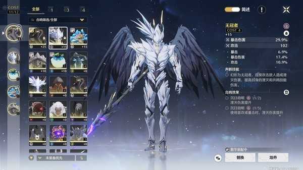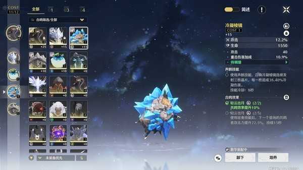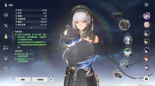 首位声骸技能因为散华配队是打的轮换输出流,所以可以选择无常凶鹭。要是想让散华打更高的伤害可以选择辉萤军势。两个四费声骸主属性一个暴击一个爆伤,词条洗双爆攻击和技能加成。