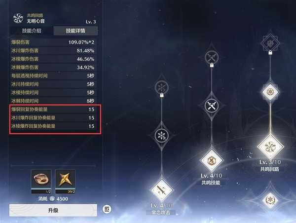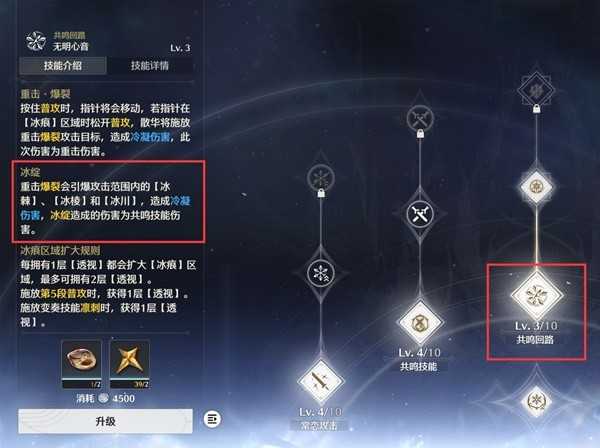 散华的核心技能是共鸣回路,它可以引爆小技能产生的冰棱,大招产生的冰川,变奏技能产生的冰棘打出不低的爆发输出,还能加大量的协奏值,基本可以让散华打完一套就可以换人了。技能描述下面的透视效果是增加你长按普攻后释放重击爆裂的判定条长度。