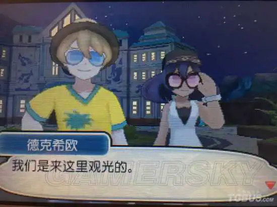 往前走到广场,遇到两个戴墨镜的神秘旅客。