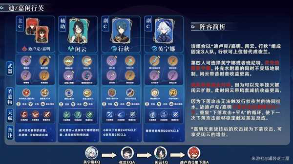 迪卢克虽然是五星里的“原始人”,但有着全游戏最高的下落攻击倍率,只是以往难以发挥,在闲云加持下靠下落攻击打输出还是有一定的强度的,嘉明作为四星角色里的“三体人”,在有闲云辅助的情况下满命甚至可以媲美五星0命角色的输出。