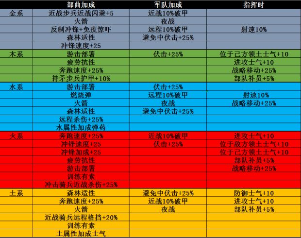 《三国全面战争》中的五行系统是本作的特色玩法,游戏中的武将、兵种都受其影响,并且不同属性的将领对部队也有不同的加成。下面就为大家带来由“綾波麗”分享的《三国全面战争》各属性将领部队加成一览表,一起来看看吧。