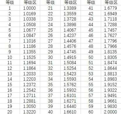 等级区 = trunc(1+ 1/59* (等级 - 1), 4)