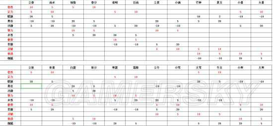 而芒种、夏至两节气,副属性分布明显错误,应该是个BUG,芒种副属性合计45点,为24节气之首,夏至合计12,副属性最低。
