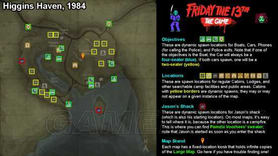 希金斯花园这张地图比较独特,因为它有三个可能刷新的汽车和船的位置。杰森家也可能会在南边的小岛上刷新,所以去找杰森妈妈的毛衣就很危险,除非你对抗的是在水中速度较慢的杰森(或者你打算就把杰森杀死在南边小岛上)。