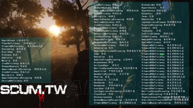 《人渣(SCUM)》中玩家角色会生不同的病,并且需要不同的方法去治。但由于目前版本汉化不完全,许多玩家可能还不太清楚自己角色生了什么病。今天就为大家分享一篇“akira7788”介绍的《人渣》全疾病中英文对照表,希望对大家有所帮助。