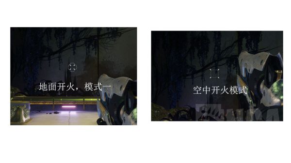 空中开火模式的是一个位于模式二与模式三之间的模式,这时内圈外圈几乎完全重叠,子弹会在圈内随机分布,如果有目标在有效射程内子弹会带有一定的粘性,但也会出现没有命中的情况且很少判定为精准伤害。在空中连续开火后一些本不会进入模式三的枪械也会进入模式三,特别是手炮。