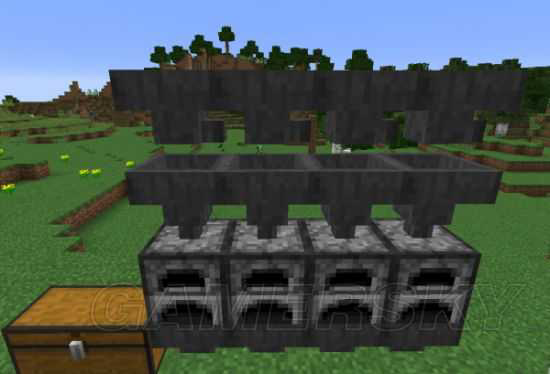 再在熔炉上方放上两排漏斗(这里很重要,第一排漏斗是对着熔炉的,第二排漏斗是对着右边的,记住最上面一排全部对着右边)。