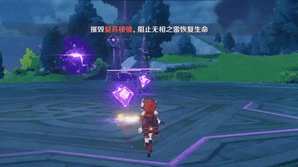 使用可莉攻击无相之雷的复苏棱镜,第一次平A成功附着元素,此时复苏棱镜的计时器开始2.5秒的计时。在2.5秒的周期内,由于受到计时器的限制,可莉的第二次和第三次攻击都未能附着元素,但由于计数器的作用,可莉第四次攻击成功附着元素。随后计数器2.5秒计时结束,第五次攻击也成功附着元素。