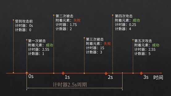 计时器:对于相同来源的元素攻击,对象每2.5秒只能附着一次元素。
