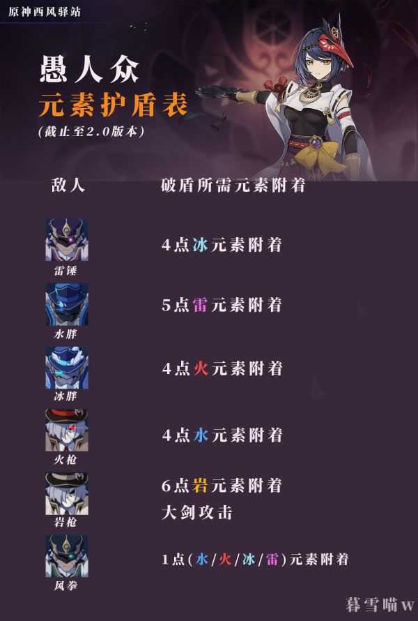 破除元素护盾主要依靠元素附着,破除不同敌人的元素护盾所需要元素附着量如下表所示: