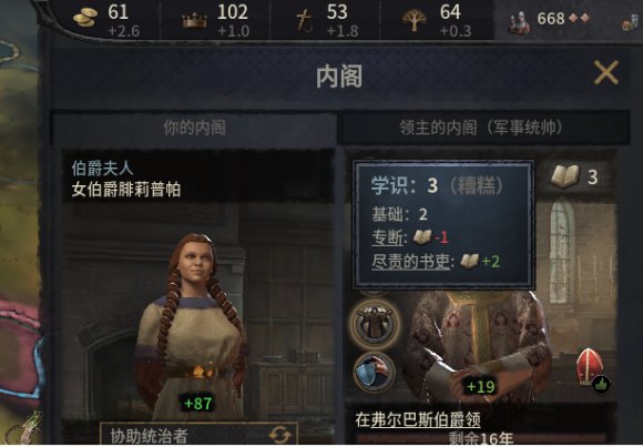 有一点新手可能没注意到就是如果内阁职位是封臣的话,那么封臣的属性是受到其配偶的加成的。也就是说你军事统帅的妻子你最好也给他找个军事高的哦。所以当你想要给你的骑士授予头衔的时候千万不要急,先帮他找了配偶再分。不然成为了封臣就只能他自己找了。你就不能帮他安排了。