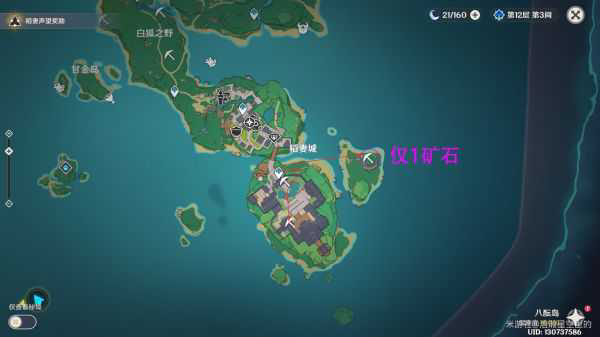 鸣神岛矿点较多,且比较分散。矿物富集的地方有:荒海两处、神里屋敷上下两处、镇守之森上下两处、白狐之野最左边一处。