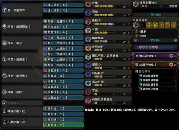 发现在满看破的情况下没办法把会心压到50%,干脆弄70%算了,这样就算打到没有软化的弱点也还是100%会心,不喜欢就拆三级看破换成攻击之类的