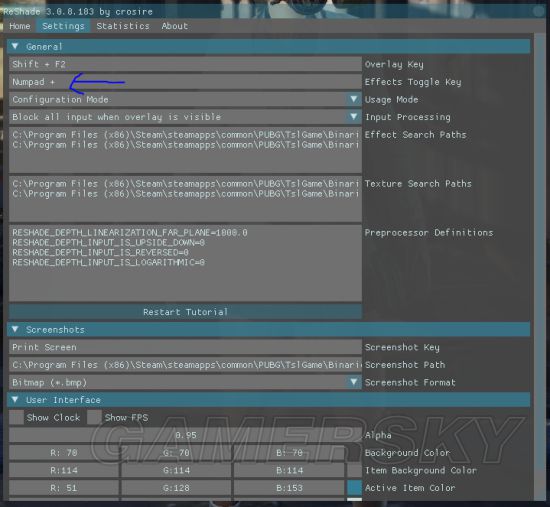 最后,可以左上角settings把蓝箭头那里添加快捷键,我用的数字区域的+,这样游戏中随时+就可以关闭和开启reshade特效,方便对比和自己更改。