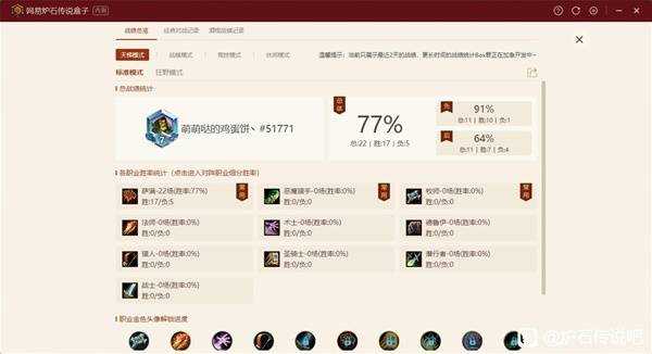 本来想玩进化萨,可惜没有曲奇,然后新版本抽到了星云和预言,感觉能搞,就组了这套。感觉打德和战士是优势元素法大势,前期顺能直接嗜血抢死。下面是几张对句和周末晚上打的胜率。