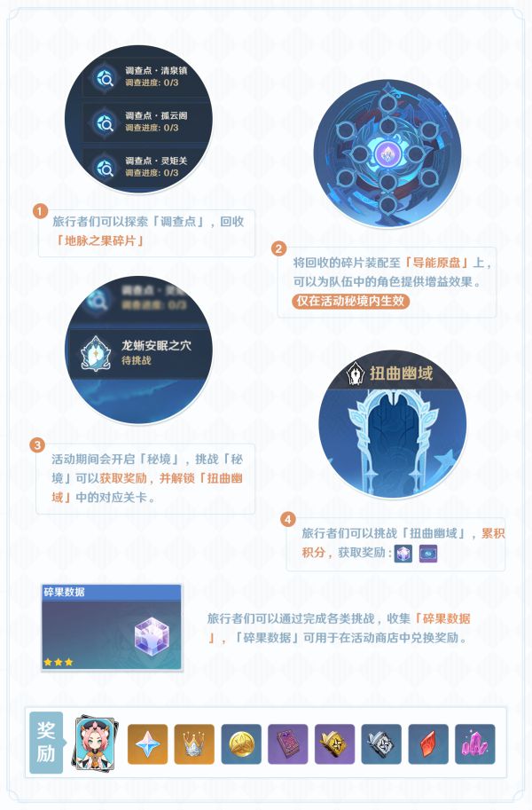 活动期间,旅行者可以通过挑战「调查点」、「秘境」、「扭曲幽域」,获取「碎果数据」,换取活动商店中的物资。