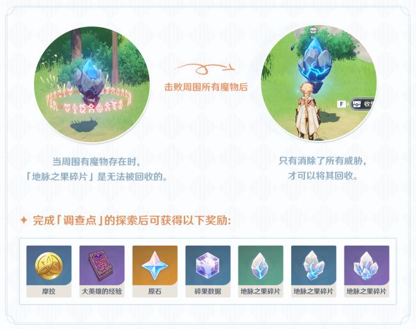 旅行者们的目标是前往各处的「调查点」,回收「地脉之果碎片」。