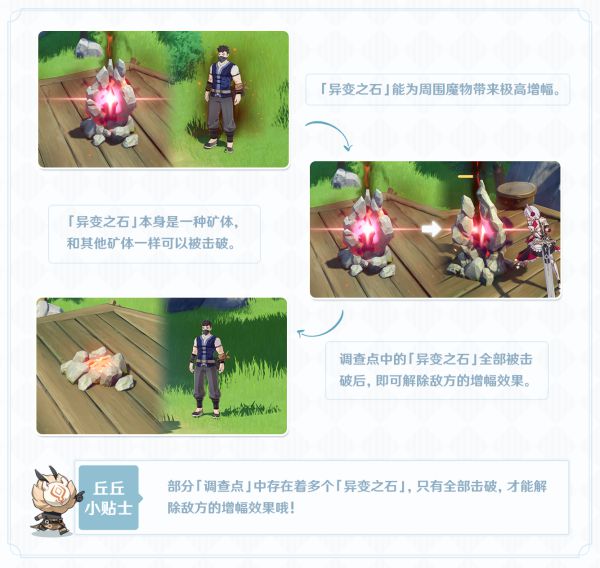 「调查点」中还存在着一种「异变之石」,可以强化碎片周围的魔物,本丘推荐旅行者们在战斗过程中优先破坏「异变之石」,再与魔物战斗。