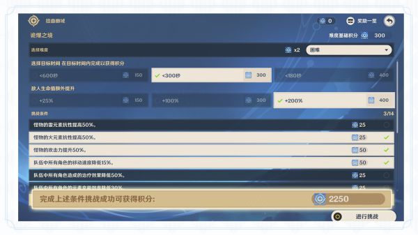正式开始挑战前,旅行者们可以选择不同的挑战难度和挑战条件。挑战完成后,根据所选择的挑战难度和条件,可获得相应的挑战积分。首次通关还可领取原石奖励。