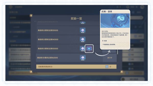 活动期间内,旅行者们可以多次挑战同一关卡,并刷新该关卡最高记录。累积挑战积分为当前所有挑战关卡最高记录积分之和,达到指定累积挑战积分时可领取「碎果数据」和限定名片「庆典·慧果」。