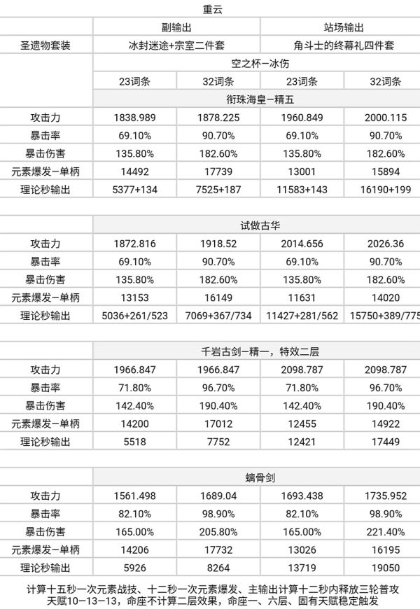 —重云(副输出):对于精炼低于等于四阶的试做古华、精炼四阶以下特效层数为一层时的千岩古剑有一定单人输出优势(略低于精一二层)。