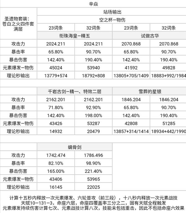 —其余武器中雪葬的星银携带物伤杯时略低于、攻击杯时略高于古华,二者差距也较小;