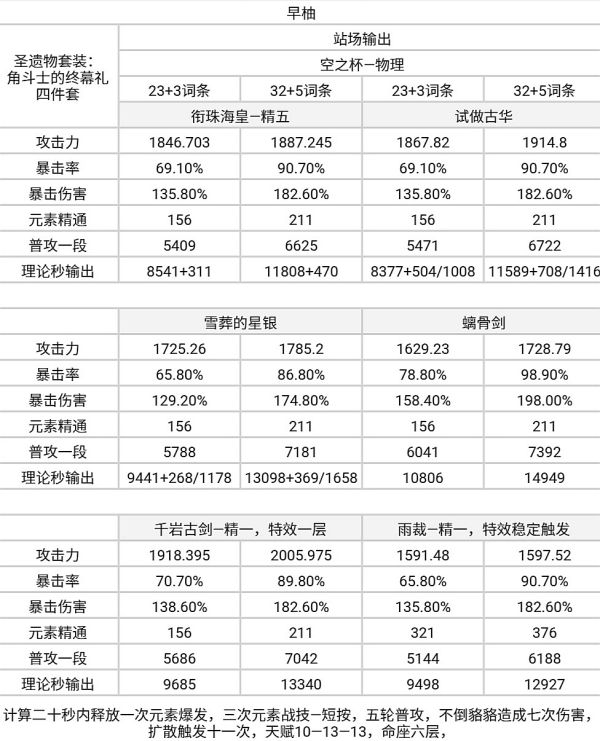 —除早柚因相关武器对比需求外,其余角色均不计算可能的反应伤害及反应带来的增益效果;