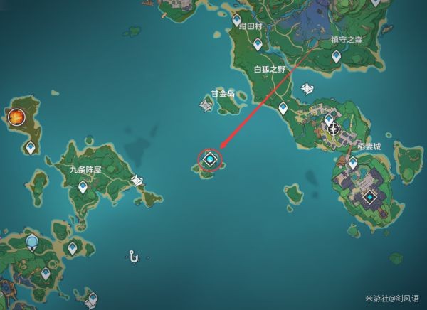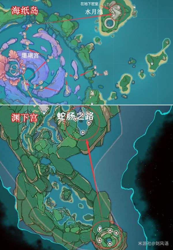 2.【珊瑚真珠】采集地点,海祗岛和渊下宫区域,一共可以采集54颗,两天刷新一次,如下图标记位置,做成一张长图,可以保持下来查看。