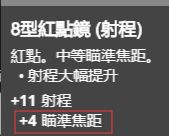一些枪械的第一栏perk,不同于常见的口径类型,为各种准镜类型perk。而这类perk除了同样提供射程属性加成,常常还可以见到+X瞄准焦距的属性: